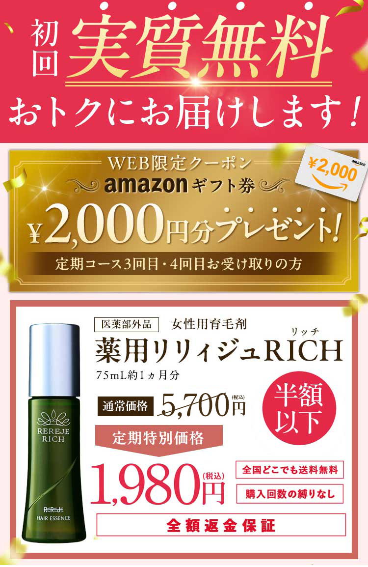 薬用リリィジュ RICHは、特に女性の薄毛や抜け毛、髪のハリ・コシの改善を目的に開発された医薬部外品の女性用育毛剤です。頭皮環境を整えながら、育毛・発毛サポートを目指すアイテムとして人気があります。